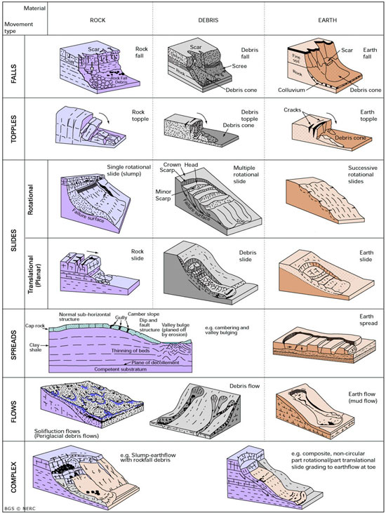 A06. There are many classifications for landslides. Varnes (1978) came up with a classification for landslides based on type of movement and material. An abbreviated version from the British Geological Survey (BGS) (2013), is given below.
